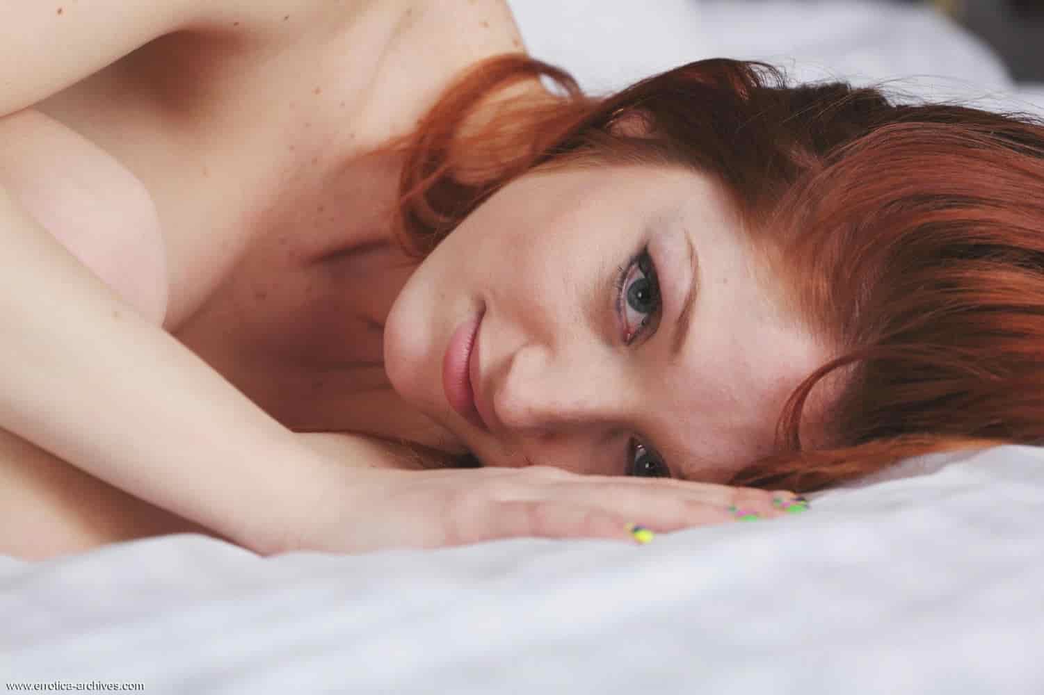 Рыжеволосая красотка Michelle H эротично позирует в постели, демонстрируя сексуальные формы