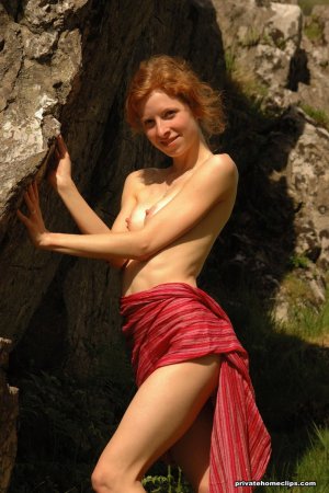 Рыжеволосая молодая девушка эротично позирует на природе показывая свое красивое стройное тело и упругую грудь.